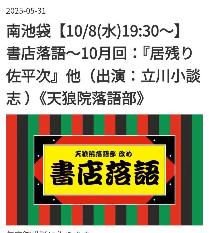 日時 2025年10月8日水曜日 受付19:00 開演19:30